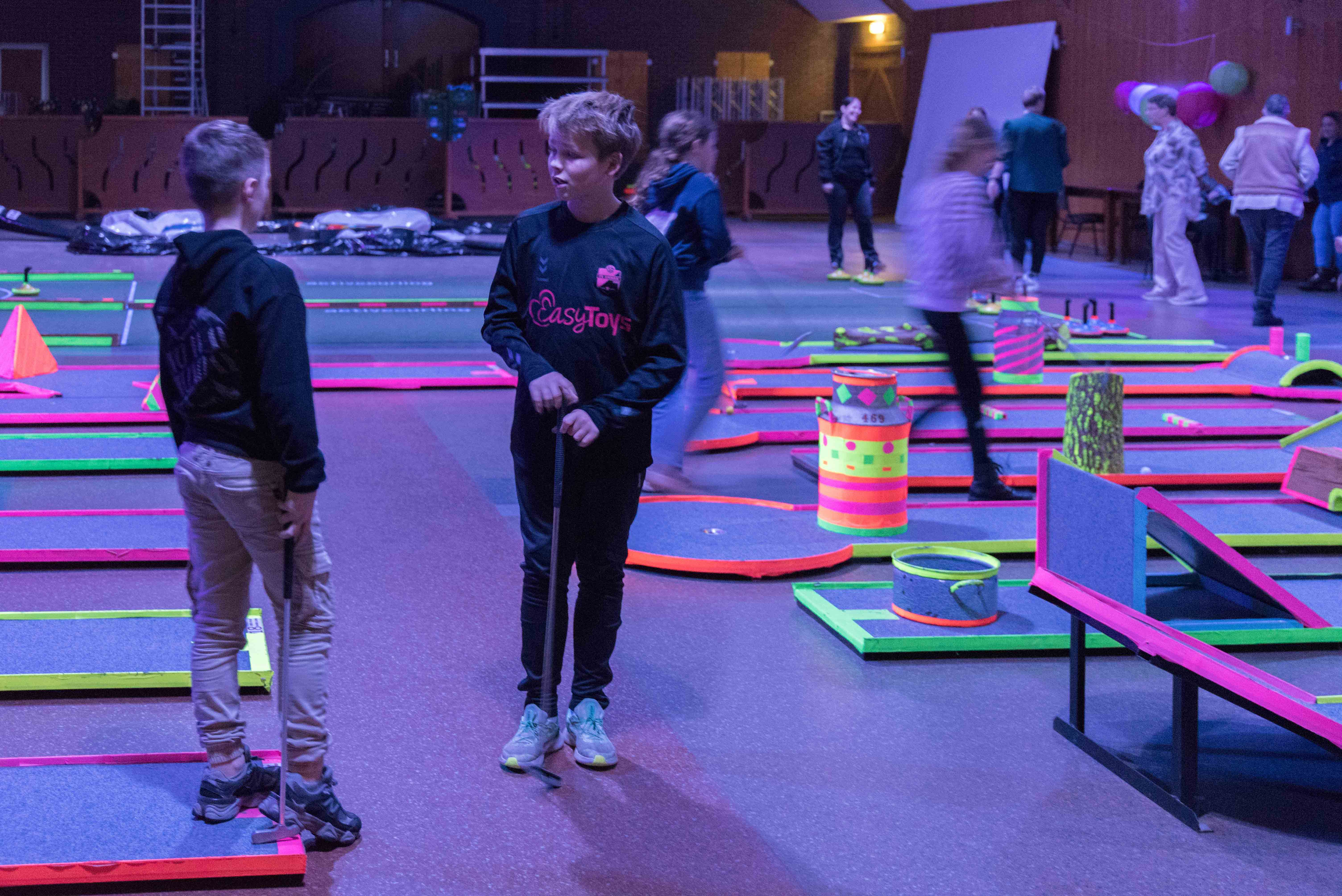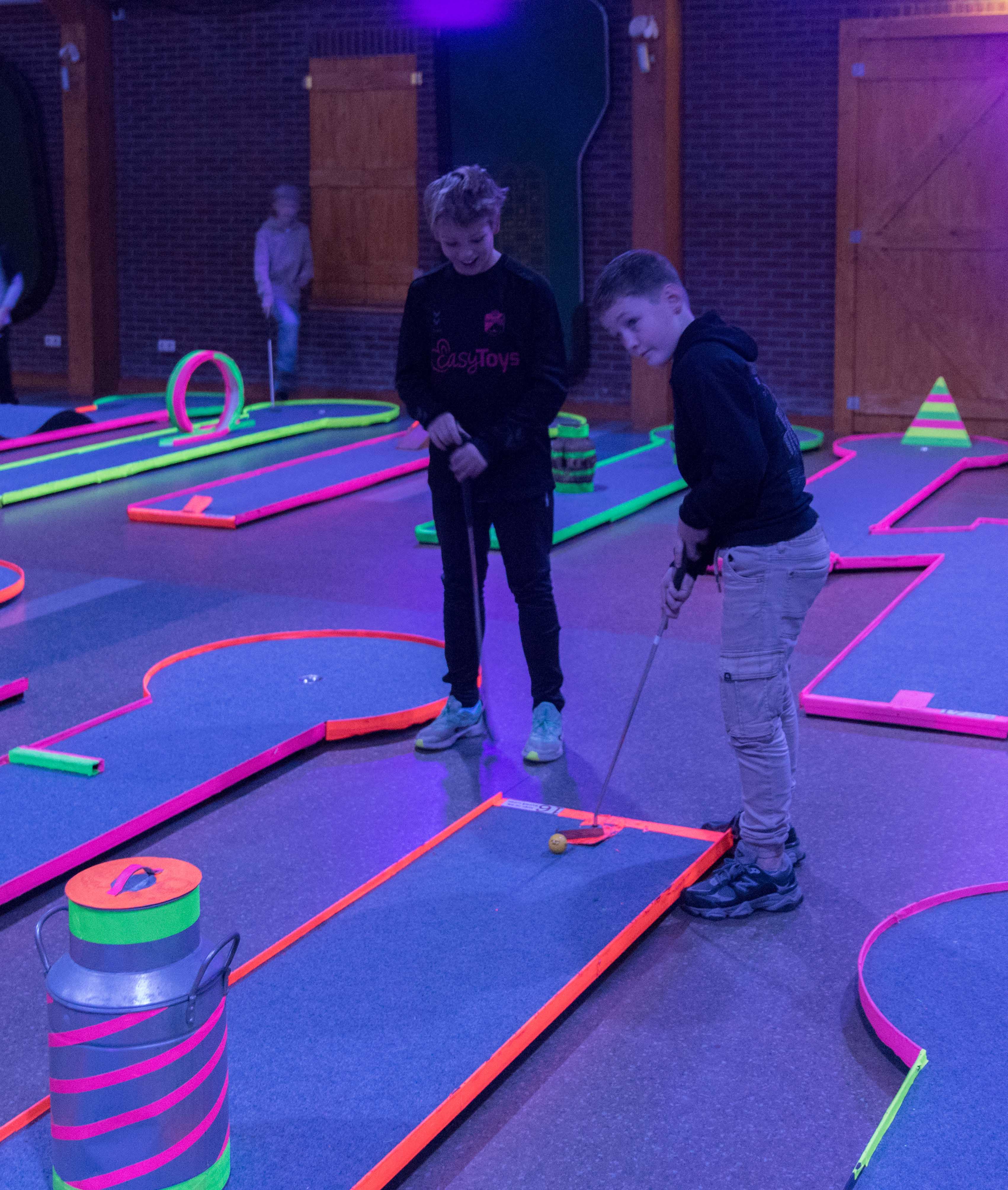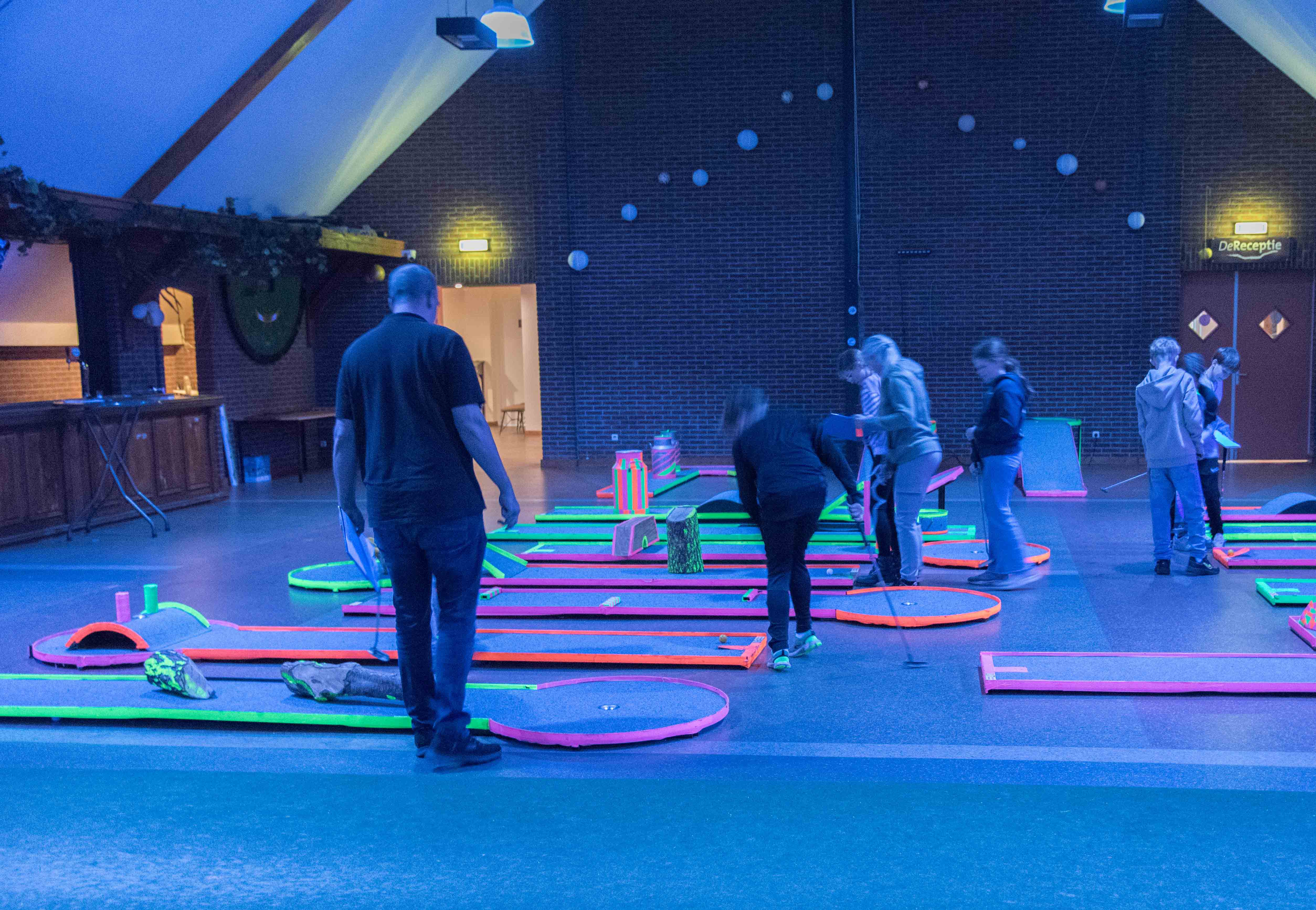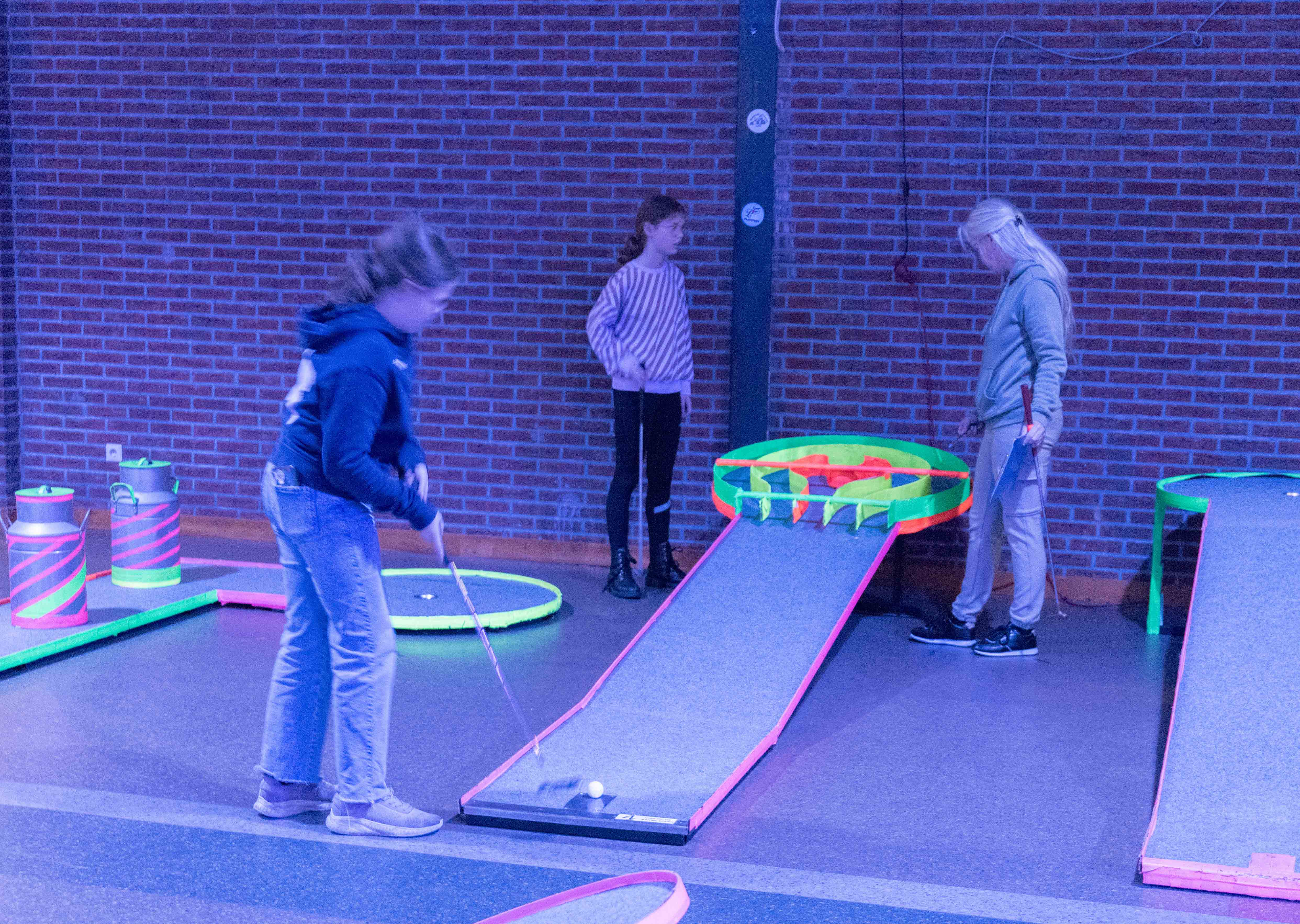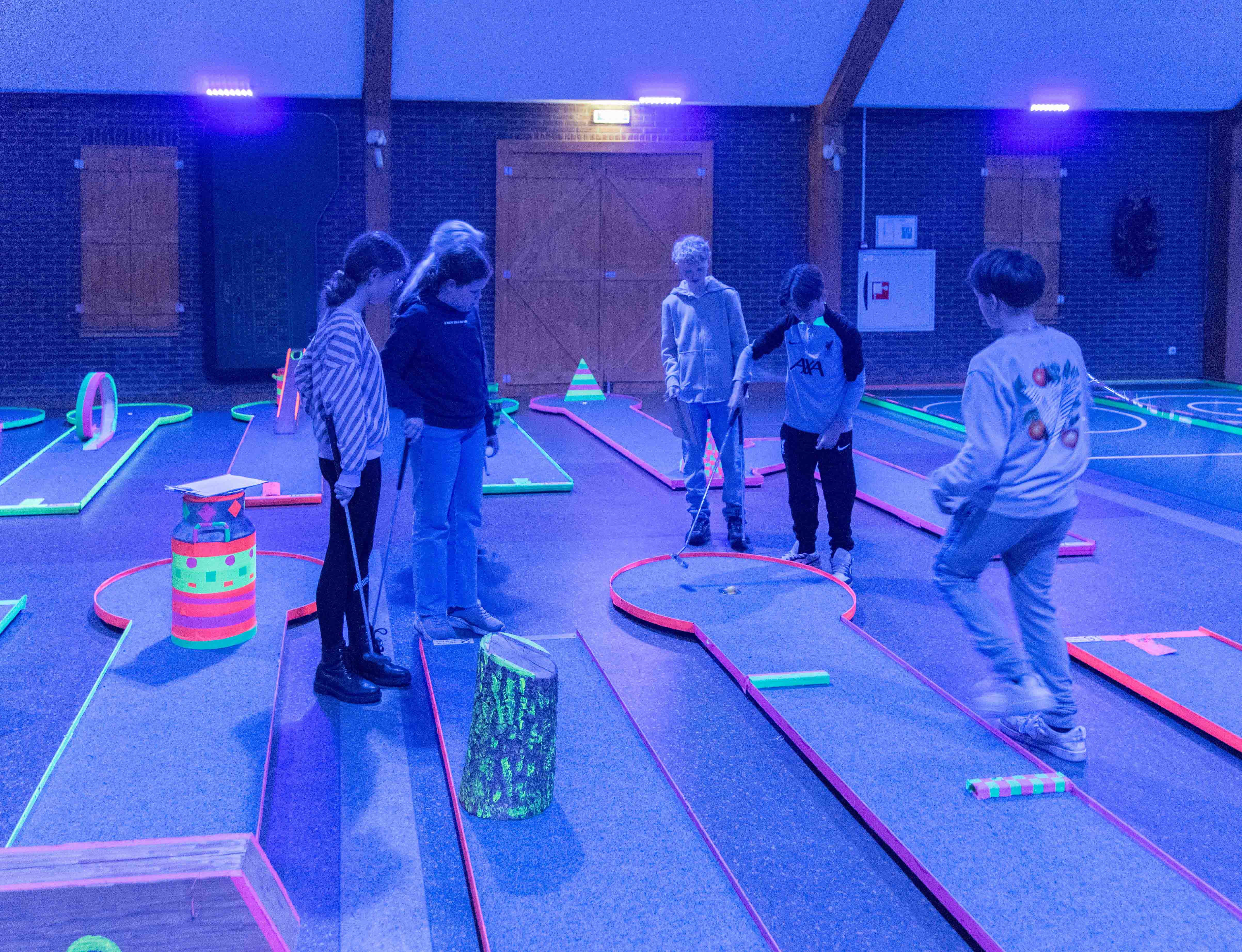 In de mysterieuze en spannende verlichting van de midgetgolfbaan hebben de jongeren met veel enthousiasme alle onderdelen afgewerkt.