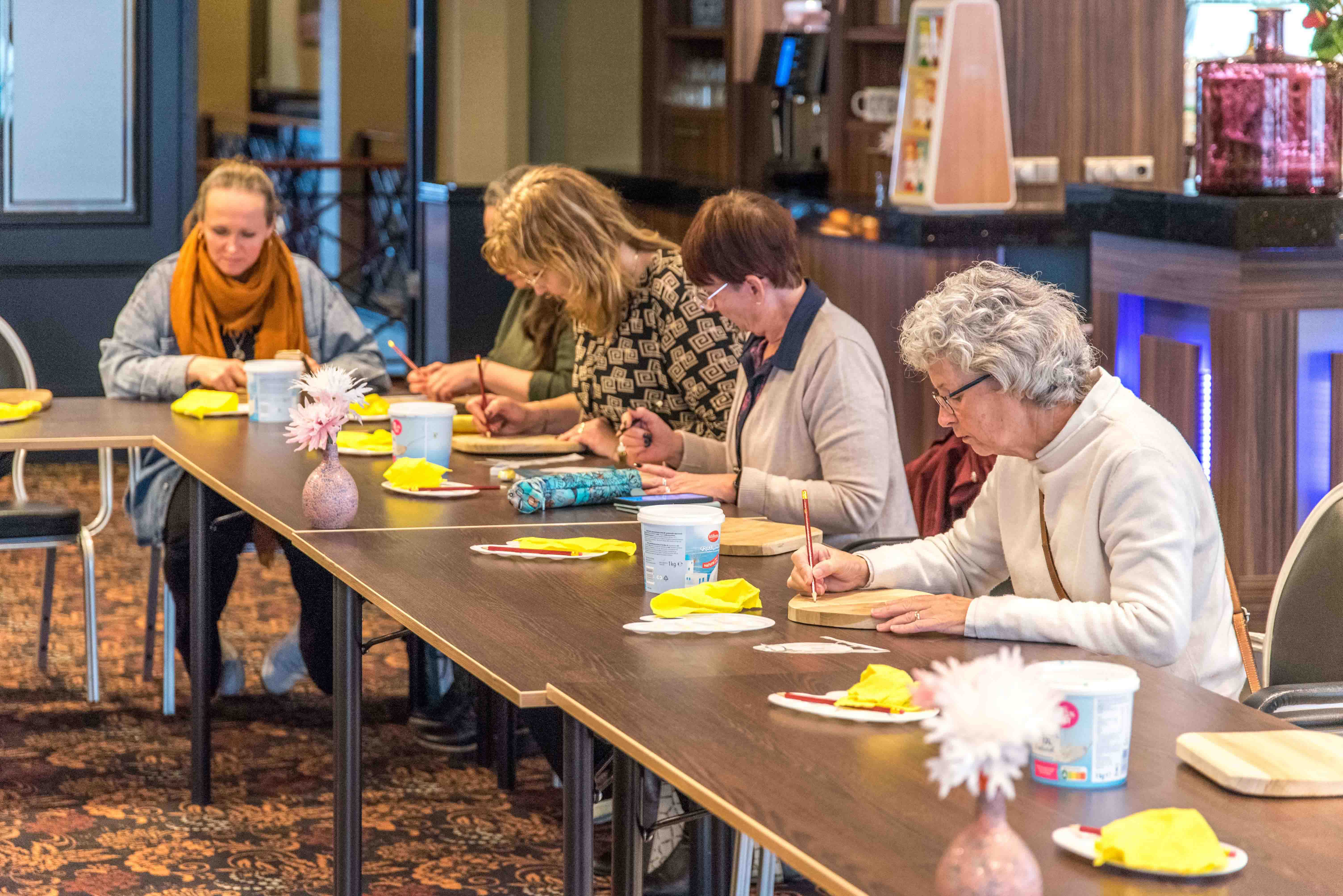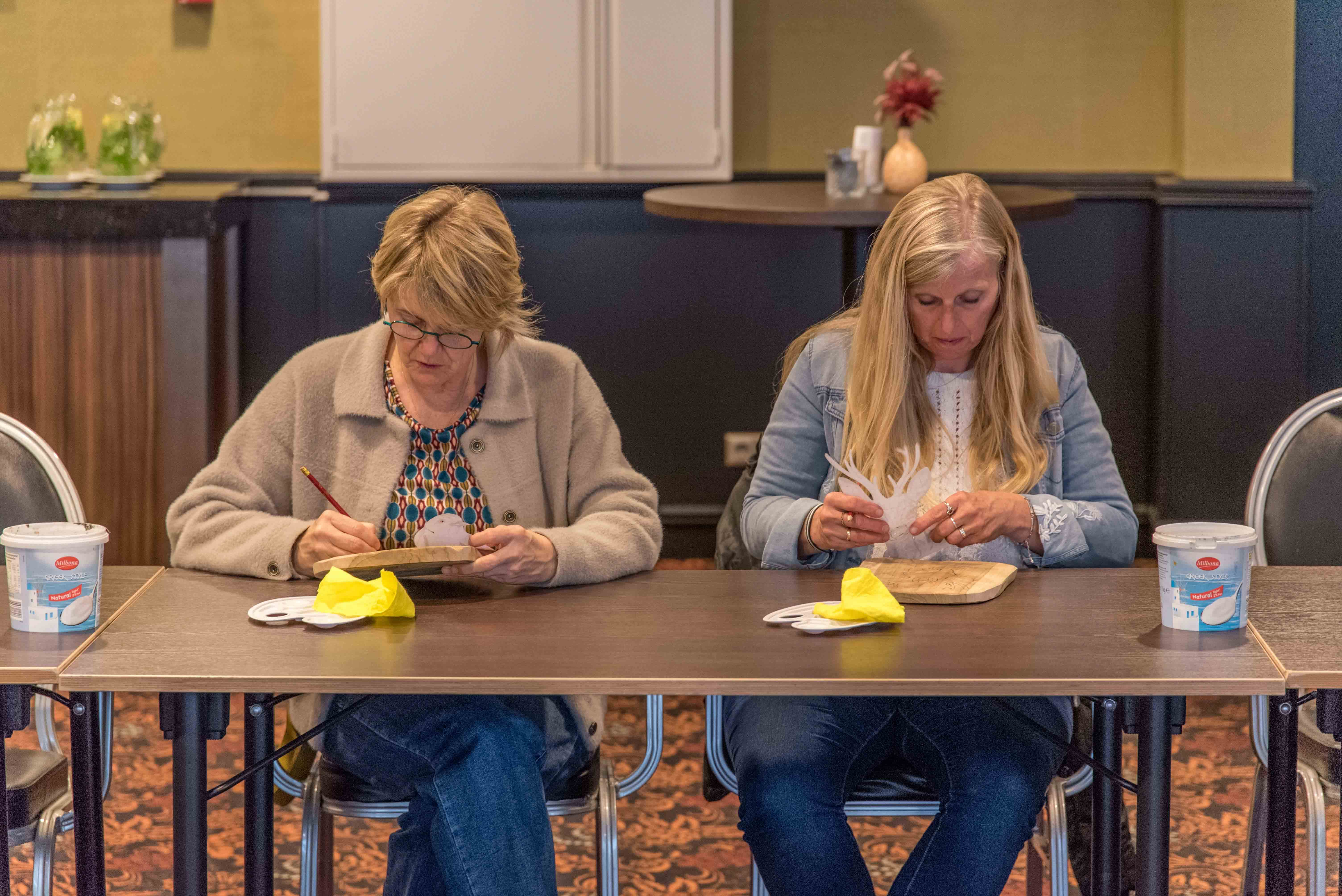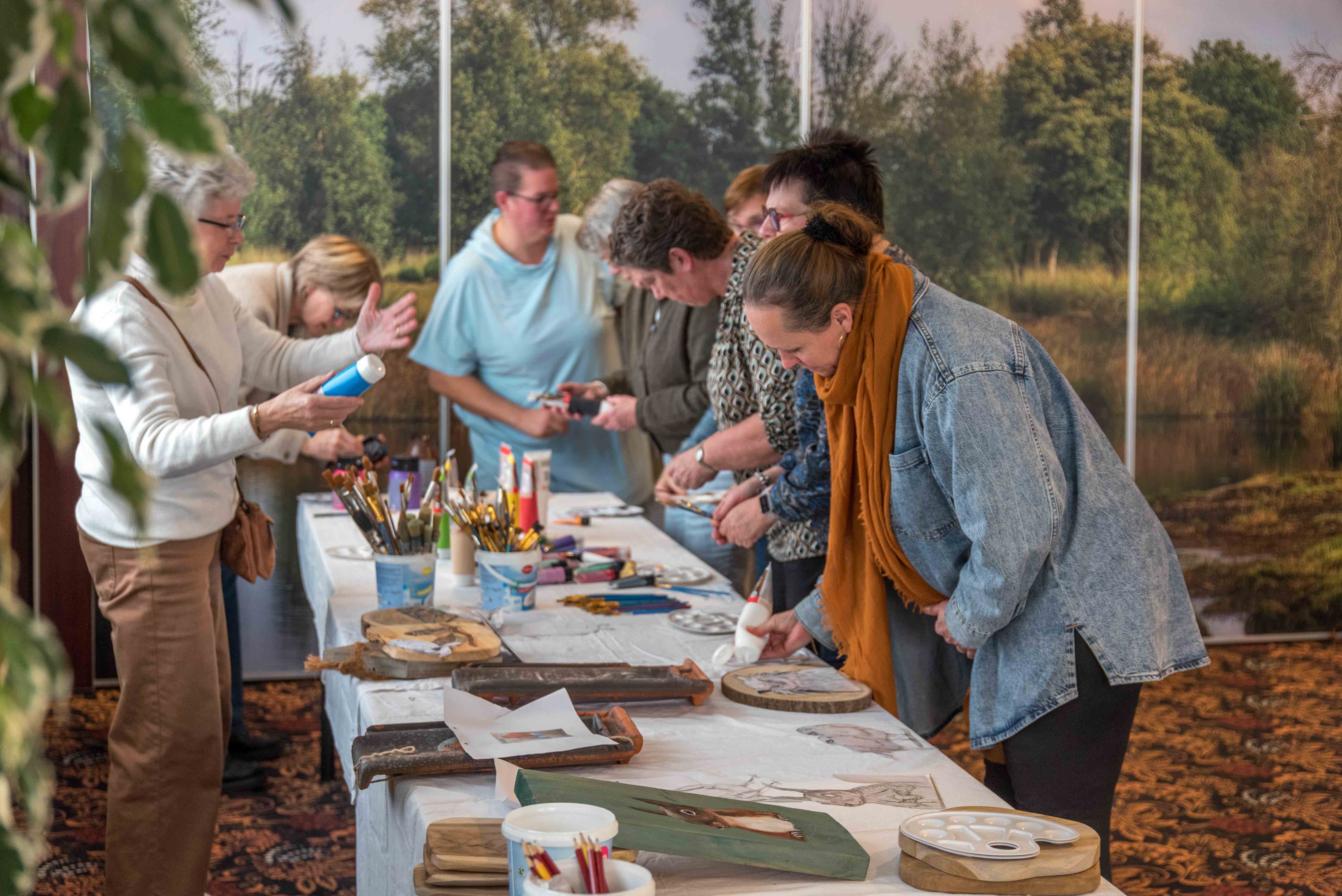 De deelnemers hebben op een teakhouten plank een schilderwerkstuk met acrylverf gemaakt. Ankie Hulst leidde deze workshop en na afloop was iedere deelnemer enthousiast over het bereikte resultaat.