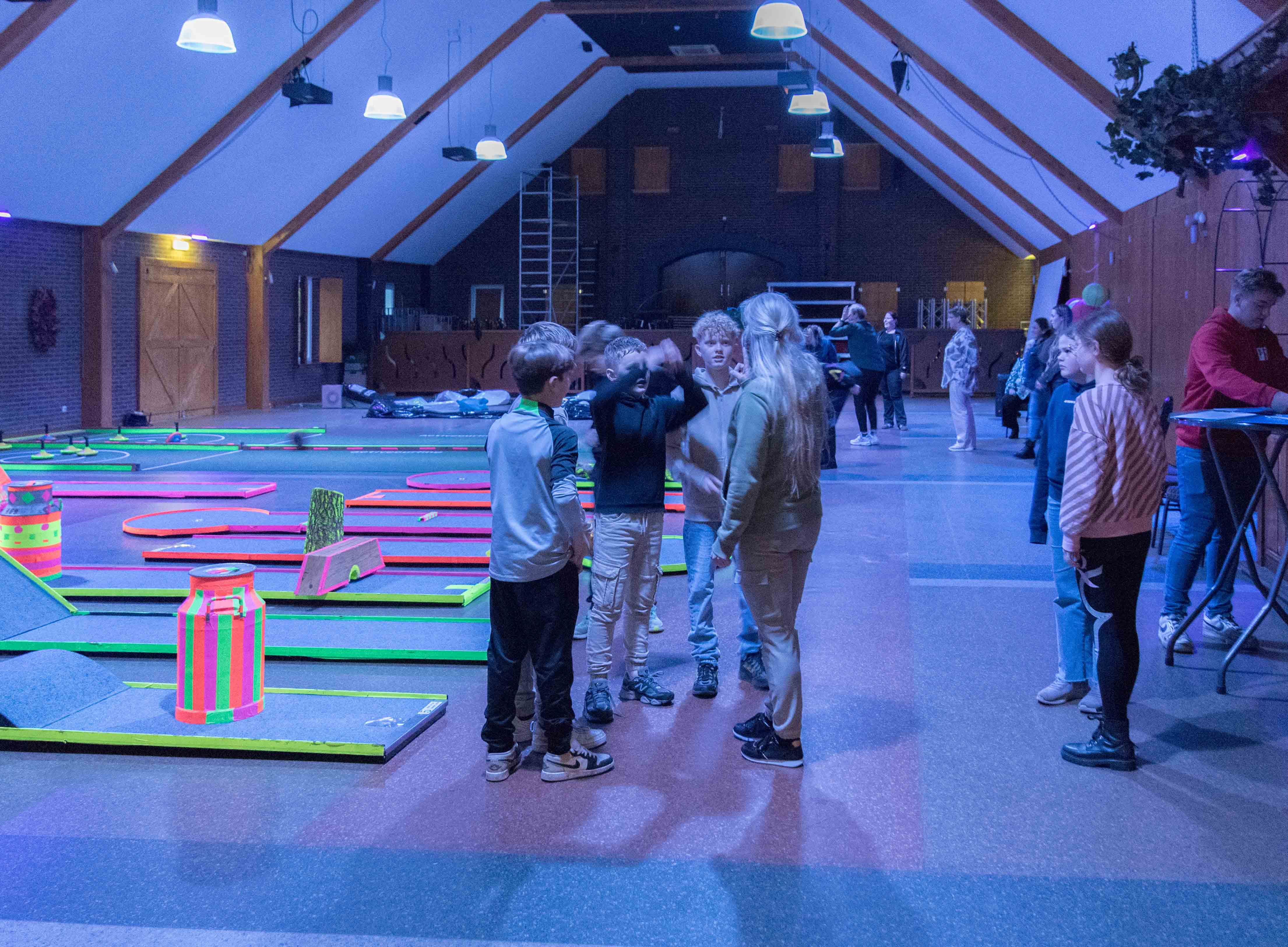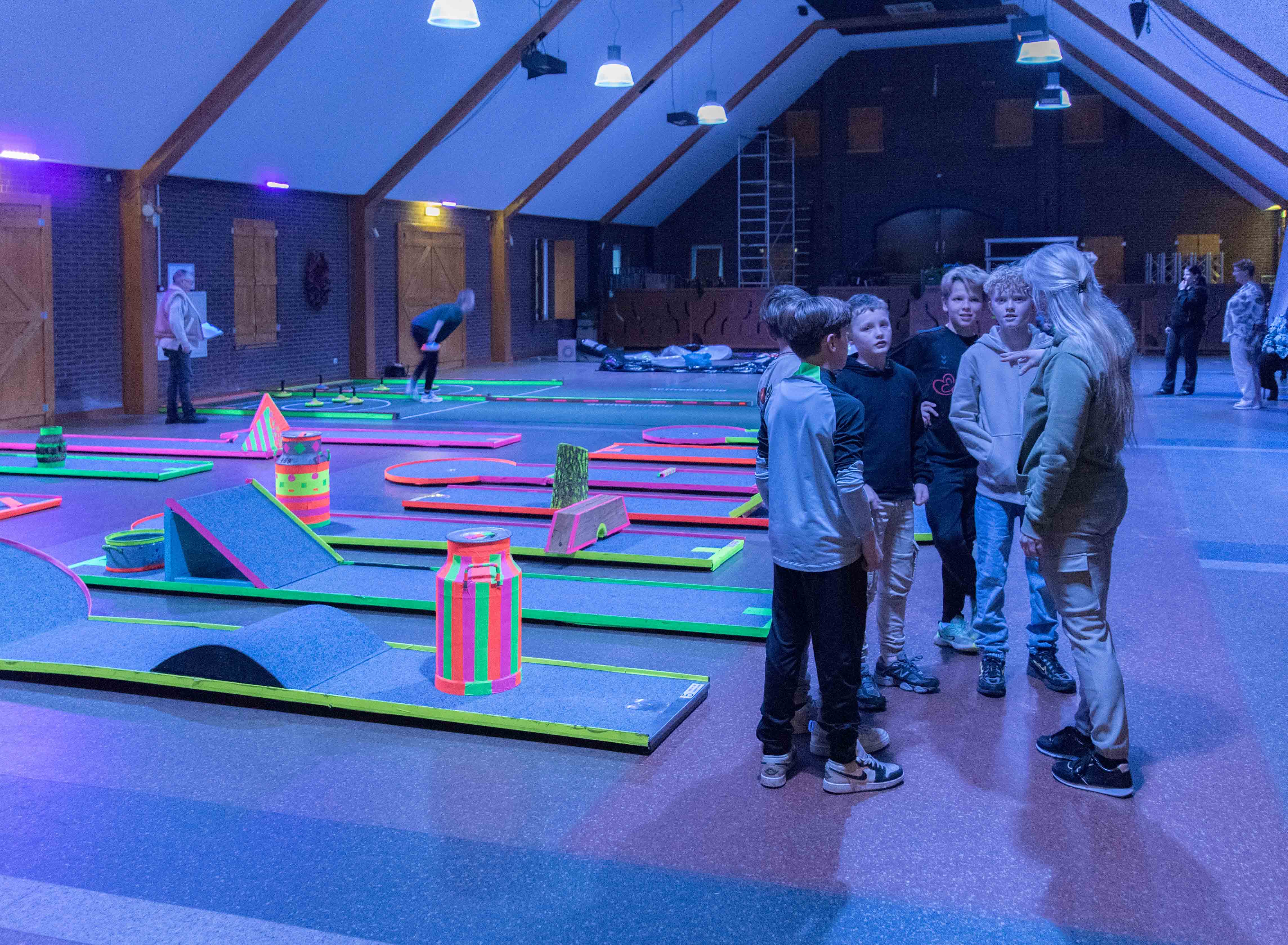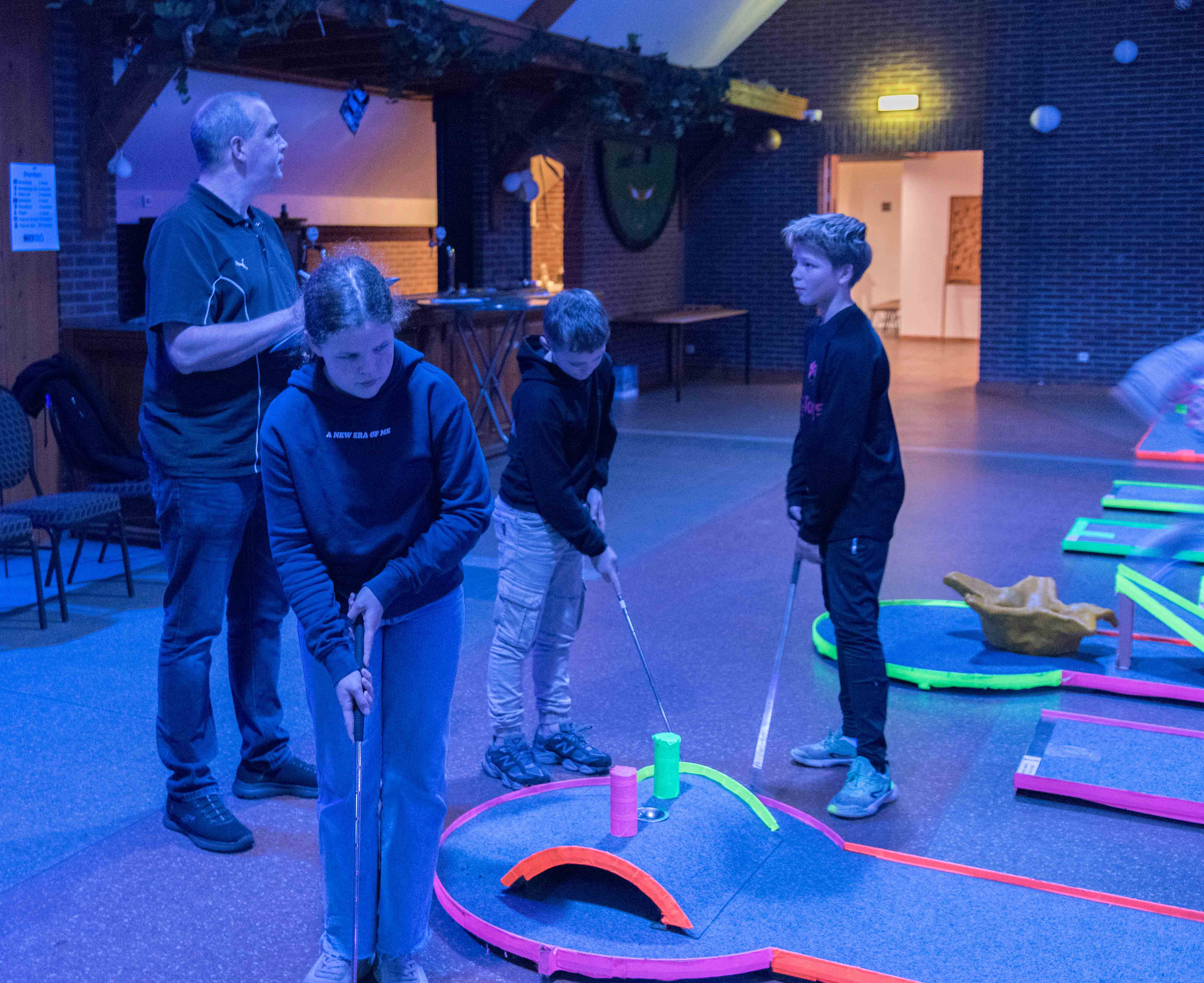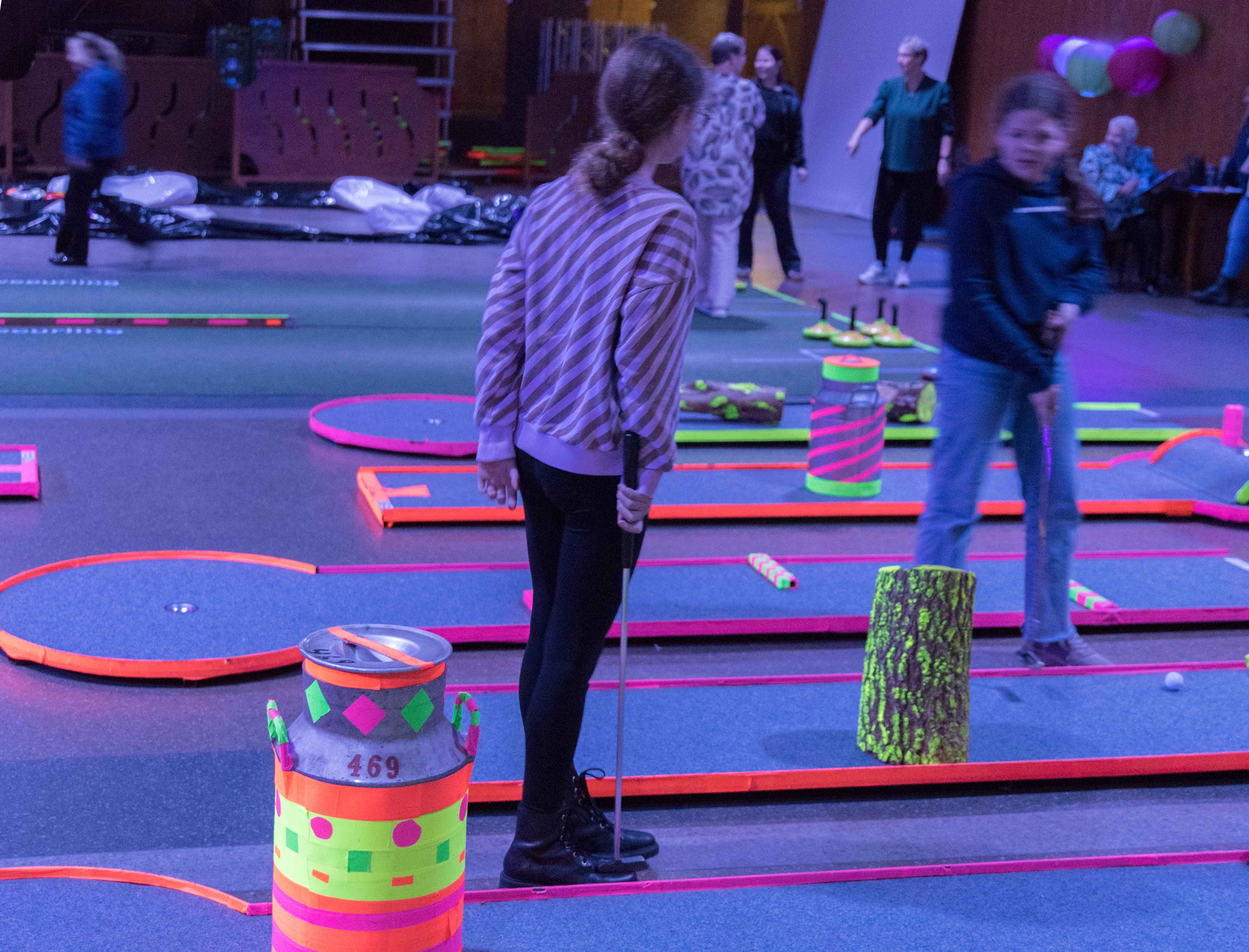 In de mysterieuze en spannende verlichting van de midgetgolfbaan hebben de jongeren met veel enthousiasme alle onderdelen afgewerkt.
