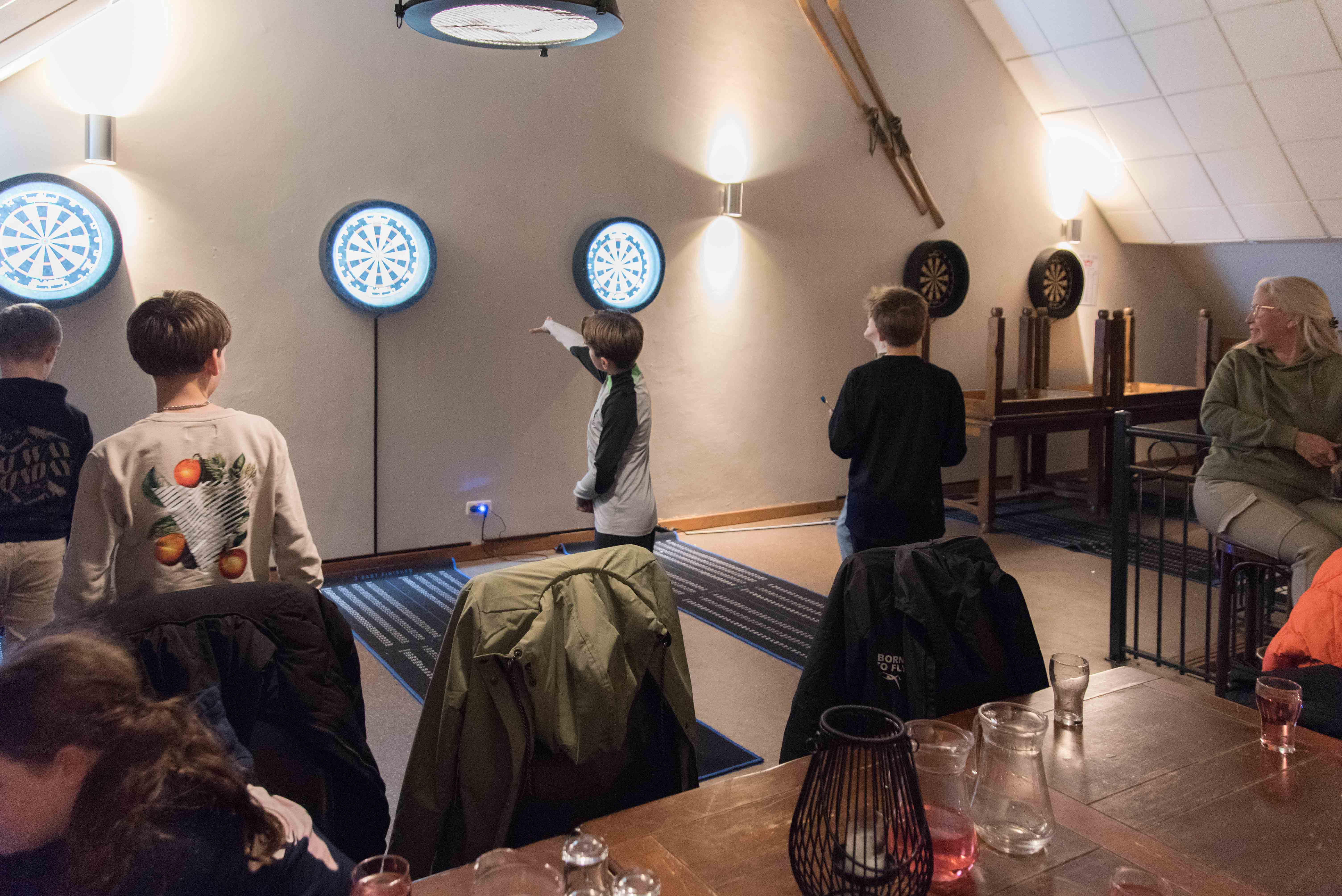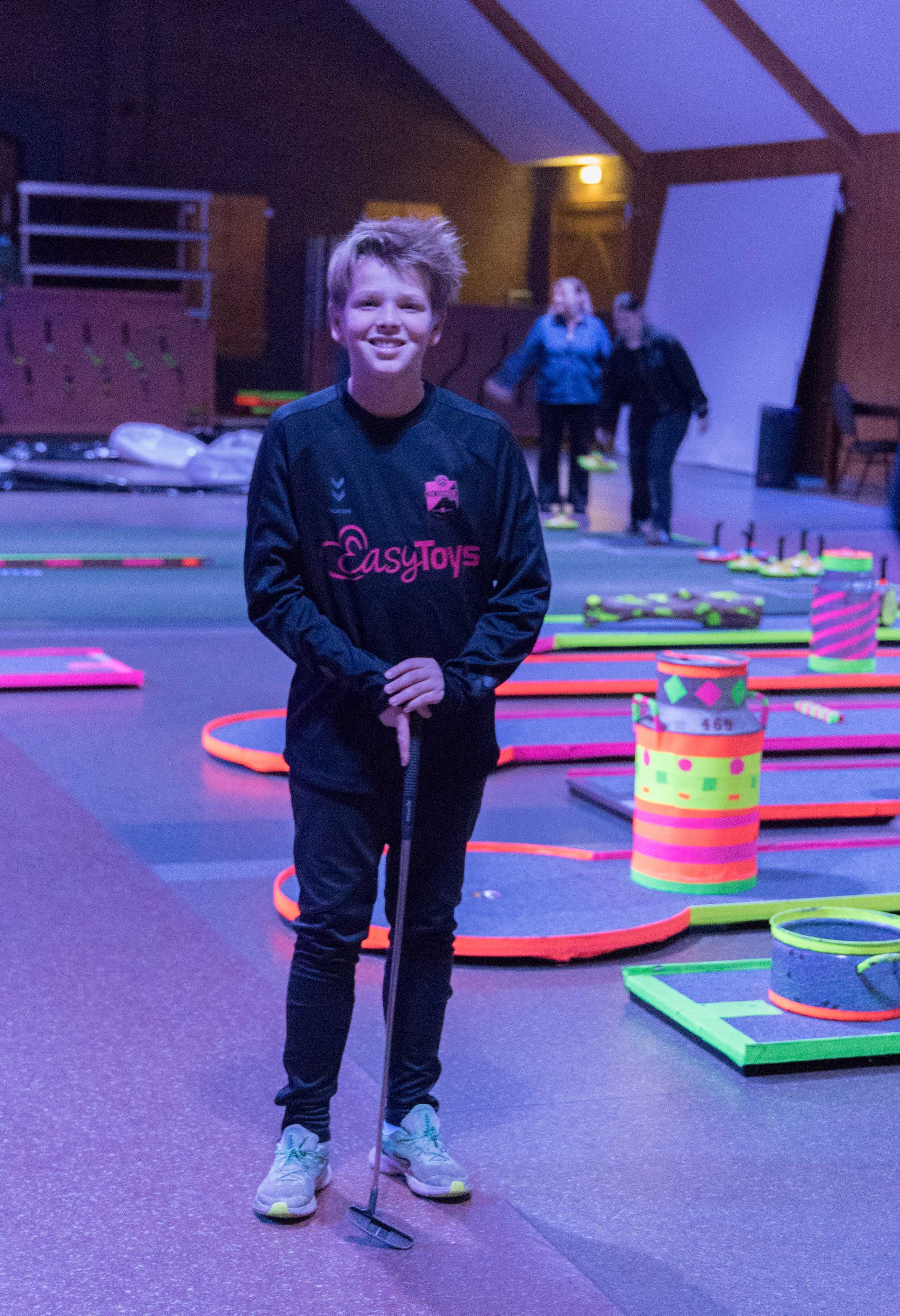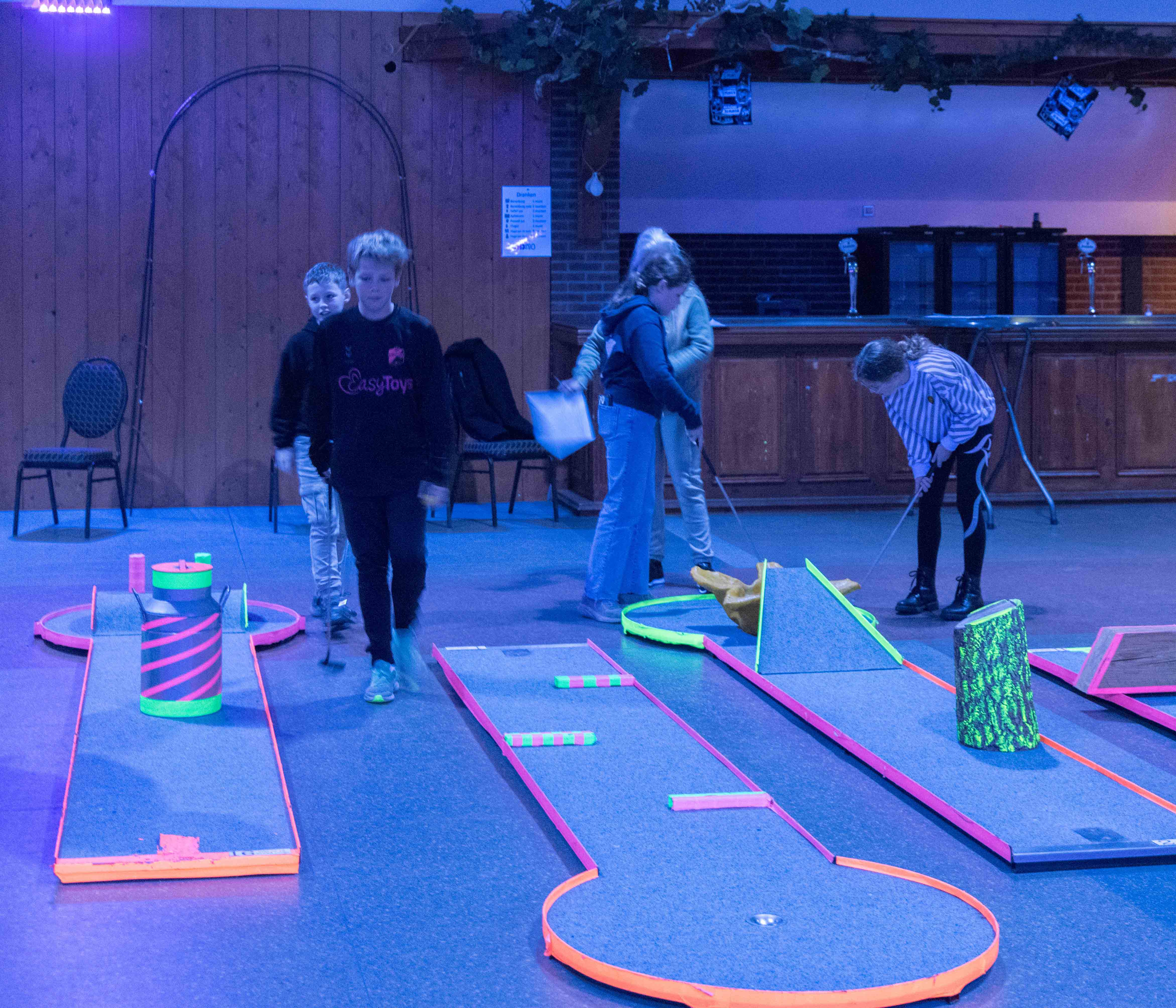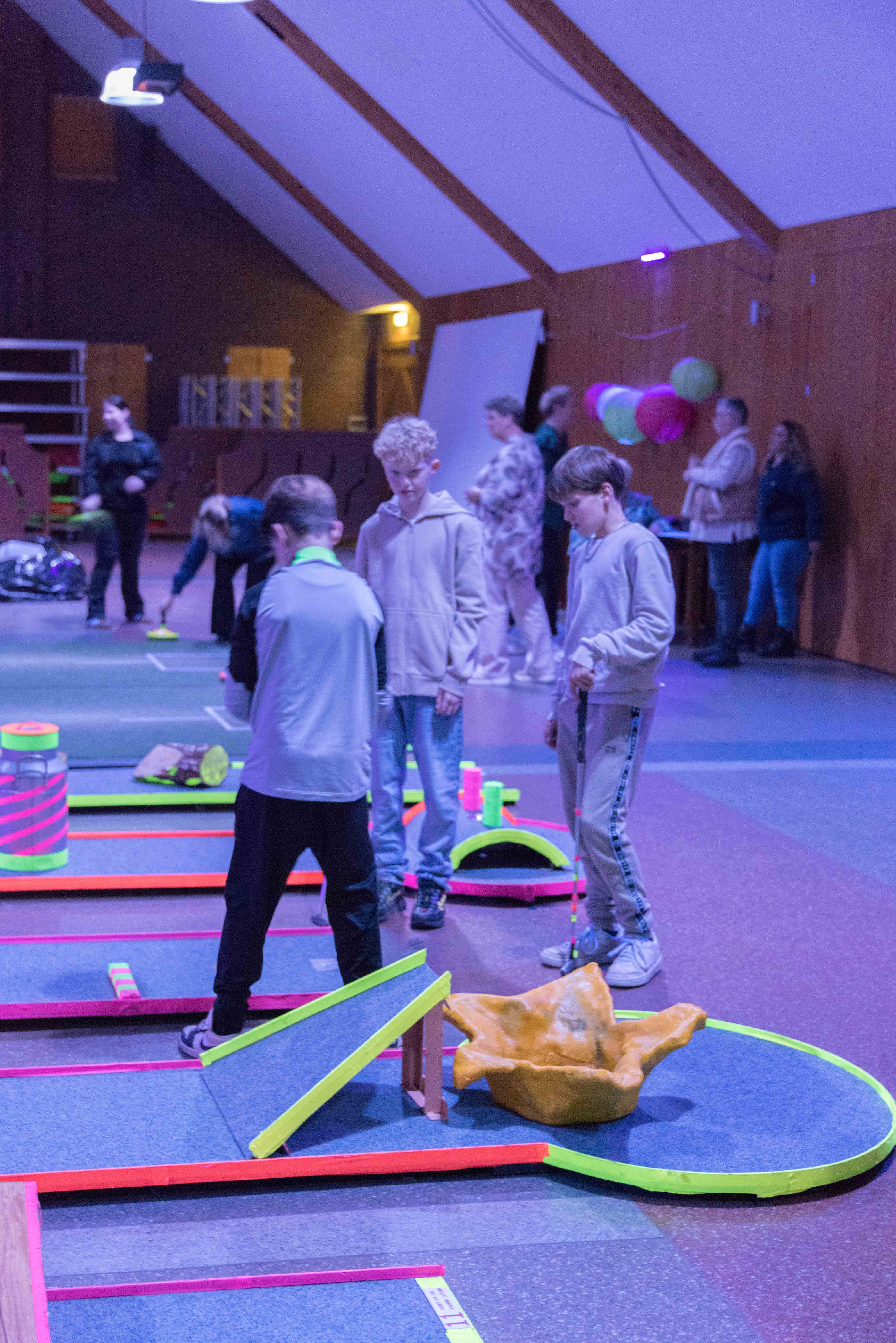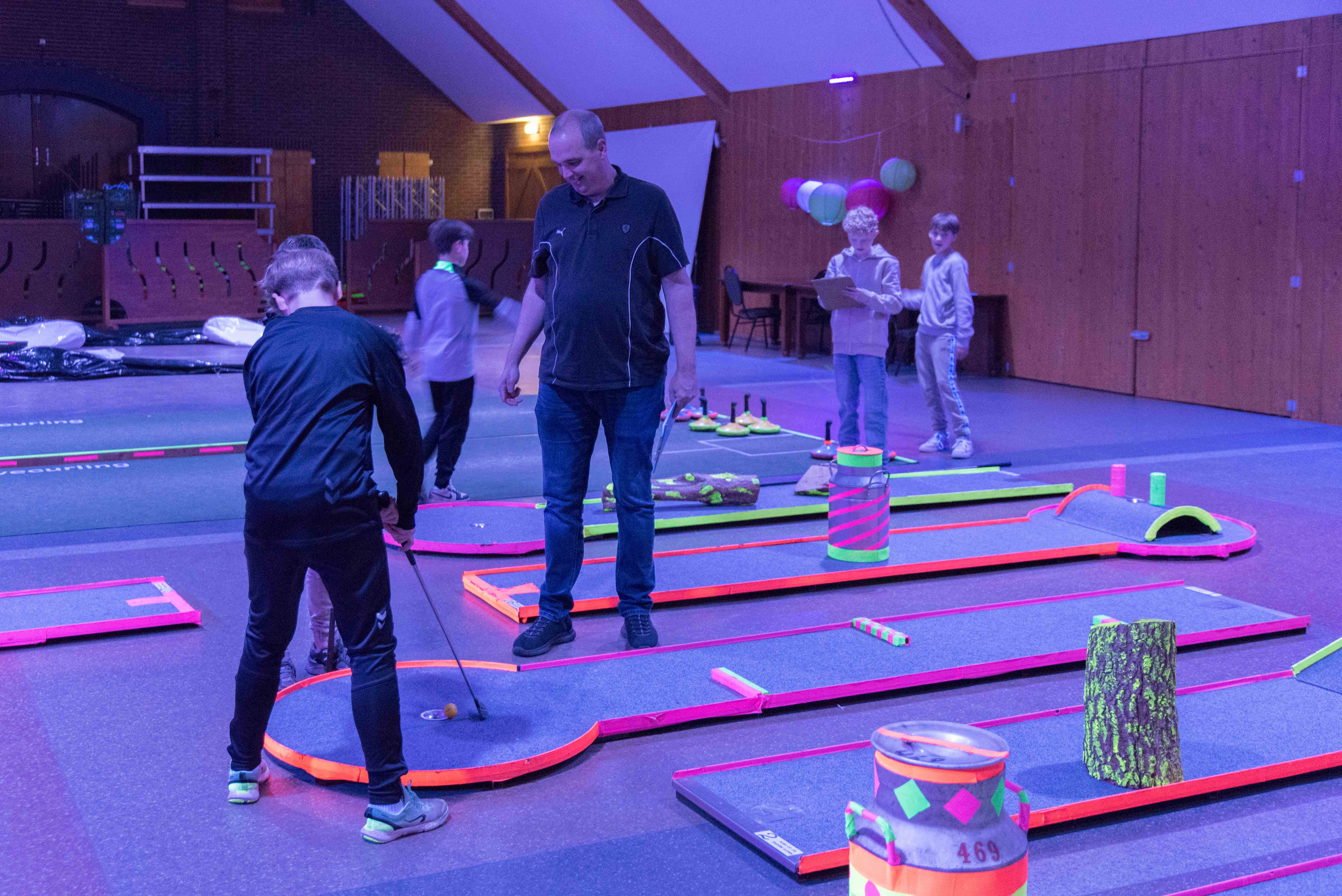 In de mysterieuze en spannende verlichting van de midgetgolfbaan hebben de jongeren met veel enthousiasme alle onderdelen afgewerkt.